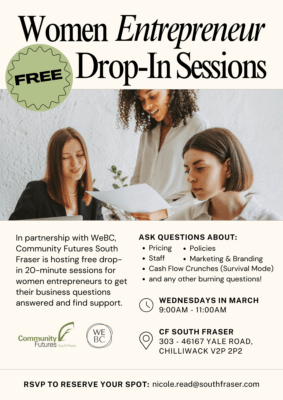 In partnership with WeBC, Community Futures South Fraser is hosting freedrop-in 20-minute sessions for women entrepreneurs to get their business questions answered and find support.