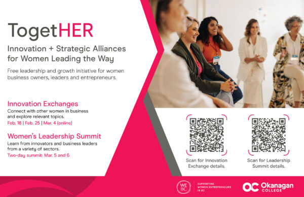 We are excited to partner with Okanagan College for a free leadership and growth initiative designed for self-identifying women business owners, leaders, and entrepreneurs, with a focus on SETT (Science, Engineering, Technology, and Trades), Food, Wine and Tourism.